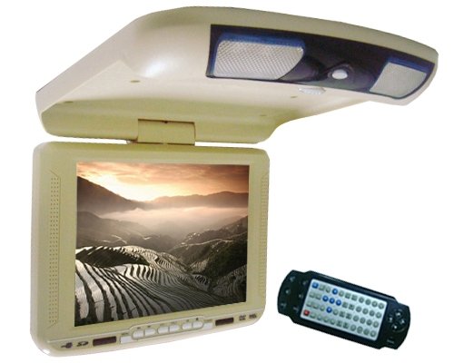 New Tan 10.4" Overhead Flip Down Roof Mount LCD Car Monitor Package With DVD Lcd with psp Wireless 32 bit game Controller: Game Disk . No messy wires everywhere in your car anymore, your children will enjoy the games much more. You have the luxury to go on those long road trips and have the kids completely entertained and quiet during the trip. FM Transmitter: Easy to connect to your quality sound system on your car without hassle: It's just another convenient thing to connect your AV devices directly 10.4 inch Brand TFT LCD screen: Now you can enjoy high quality movies/DVD with this SHARP screen with enough brightness. USB connectivity, SD/MMC/MS card reader: . easy installation: Contents: Roof Mount Over head 10.4" LCD monitor + all-region DVD player (plays all dvd's of any format) + Game Discs x Wireless Remote Game controller. 10.4-inch high-definition TFT LCD 16:9 screen Use is Sony lens and Electronics Game function, include 32 bit games with joystick Compatible DIV-X, MP4, DVD, VCD, SVCD, CD, CD-G, MP3, JPEG, WMA, CD-R, CD-RW, and DVCD. FM transmitter function, Plays Sound Through Your Vehicles Speakers Wirelessly A/V input and output functions for connection to other devices Supports SD, MS, and MMC 3-in-1 card reader USB function 1 wireless remote control s Supports OSD display Multi-viewing angle by 350 degree rotating