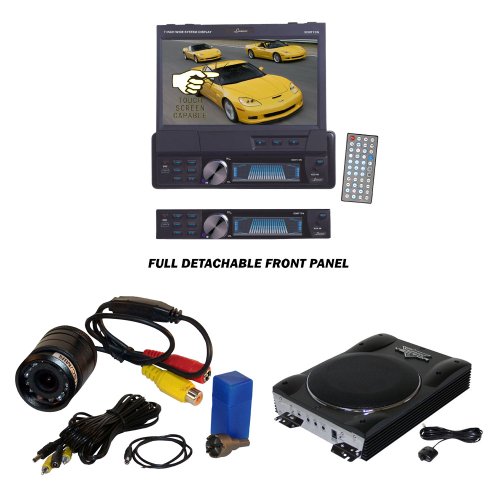 Lanzar Car, Van, Truck DVD Player, Amplified Subwoofer and Pyle Camera Package - SDBT73N 7'' Single Din In-Dash Motorized Touch Screen TFT/LCD Monitor With DVD/CD/MP3/MPEG4/USB/SD/AM/FM/RDS Receiver - VCTBS8 Vector 8'' Ultra Slim 600 Watt High Power Amplified Subwoofer Enclosure - PLCM22IR Flush Mount Rear View Camera w/ 0 Lux Night Vision
